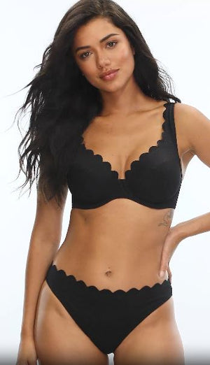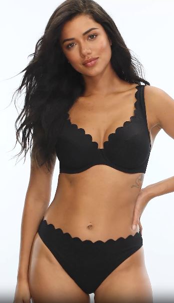 Introducing our new Spirit range to the Panache Swim collection - full of timeless silhouettes in a luxurious Spanish honeycomb textured fabric, this collection epitomizes classic chic. The Lauren Plunge Bikini Top features a plunging neckline that adds a touch of glamour, while the scalloped edges bring a playful charm to the design. Whether you're lounging by the pool or strolling along the beach, you'll feel effortlessly chic and comfortable in this classic black bikini.