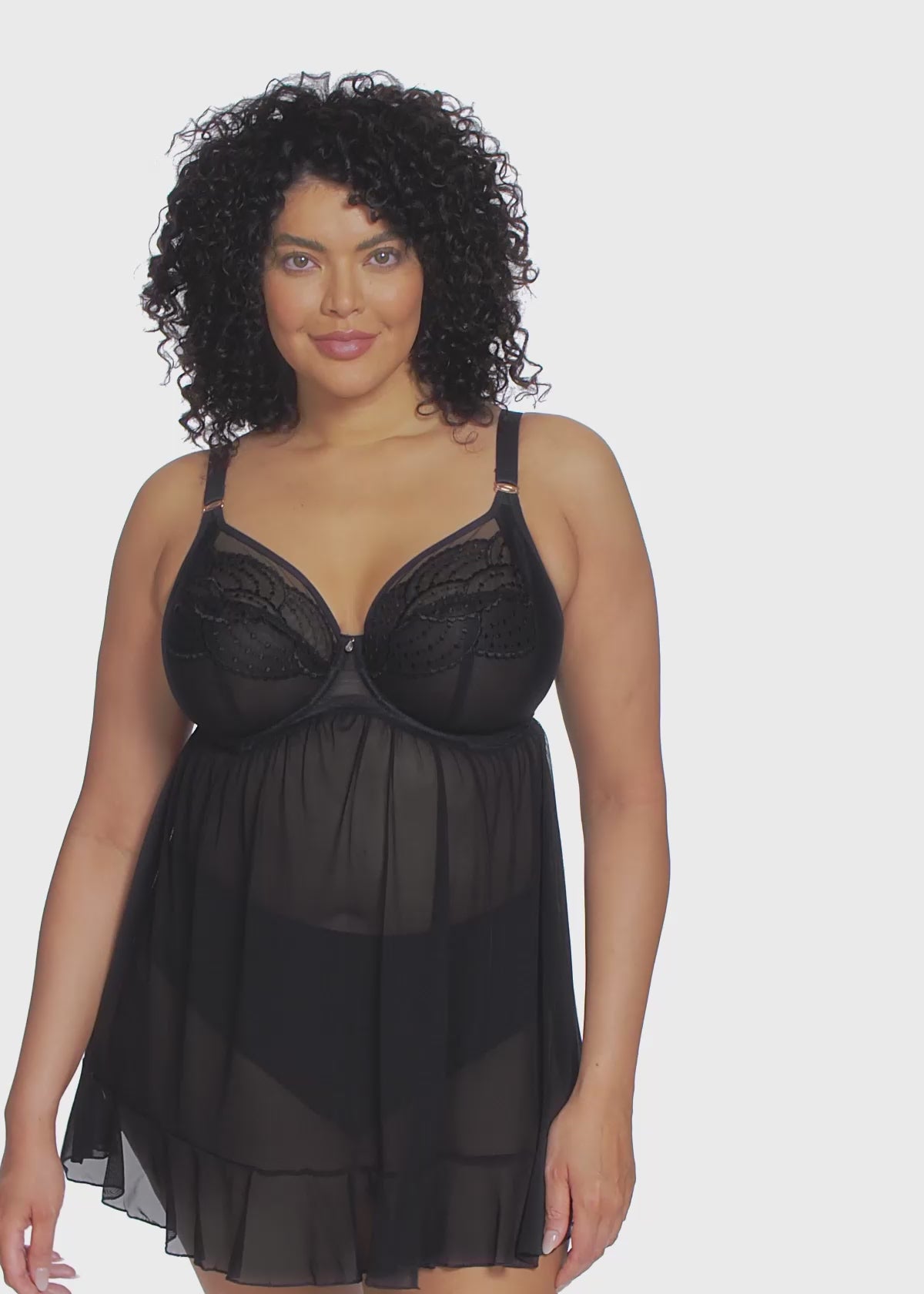 Introducing Priya, Elomi’s new luxury collection that embodies all things 1920’s glamour. Featuring an embroidery inspired by decadent chandeliers and draped beading, the intricate design dances across the top cup and down the centre front with a tattoo style panel at the underbust. This Babydoll has a flattering stretch mesh thigh length skirt, finished at the bottom edge with a flouncy frill. A rose gold charm detail at the centre front completes the look.