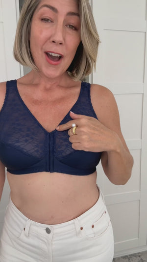 The Exquisite Form® Fully® Front Close Posture Bra with Lace. The secret to helping your figure fall beautifully into place. Reinforced crisscross powernet stretch fabric straightens shoulders and supports your back to create a noticeable difference in posture. Wide stretch sides and wide camisole straps offer exceptional comfort. Two-piece cups feature lovely lace tops and double support undercups that give your figure excellent support and a gentle lift for a youthful silhouette.