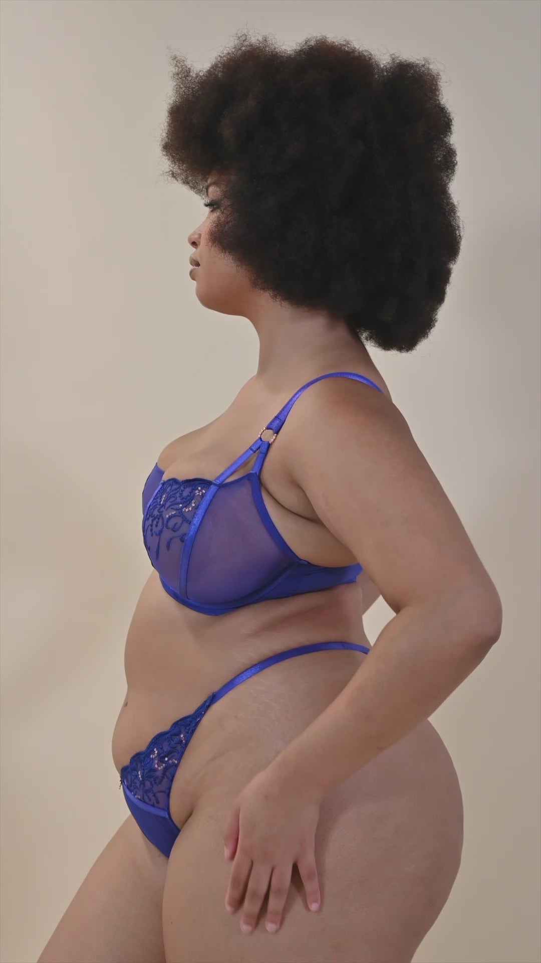 Dazzle in the stunning Ornate balcony bra Ultraviolet Blue. This Scantilly classic offers enhanced coverage and a perfectly positioned strap for ultimate comfort. Crafted from striking sheer fabric, the bra features exquisite chandelier-inspired embroidery across the cups, accented by shimmering metallic rose gold yarn.
